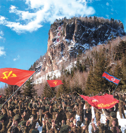 Mit dem Bergpass Cholryong hinterliess Kim Jong Il auf hohen und steilen Bergen des Vaterlandes wie auf dem Berg Osongsan, der Höhe 1211, dem Berg Jihyesan, dem Bergpass Jikdongryong und der Höhe 351, die sich an der vordersten Front befinden, seine hehren Spuren. In diesen Tagen verstärkte und entwickelte sich die Volksarmee zu einer revolutionären Armee, die politisch, ideologisch und militärtechnisch ausgezeichnet vorbereitet ist, und die DVRK demonstrierte als ein unbesiegbarer mächtiger Staat ihre Würde vor aller Welt. Unter dem Banner des Songun leitete Kim Jong Il klug den Aufbau einer sozialistischen Wirtschaftsmacht an. Dank der Bemühungen von Kim Jong Il, der sich für das Gedeihen des Landes und für das Glück des Volkes einsetzte, wurden auf unsere Art und Weise das Eisen, die Faser und der Dünger hergestellt und das Spitzenniveau der Wissenschaft und Technik erreicht, was die ganze Welt in Bewunderung versetzte. Überall wurden die großen, mittleren und kleinen Kraftwerke errichtet, viele Fabriken rekonstruiert, Hunderttausende Hektar große Ackerbaufläche bereinigt und unzählige schöne Wohnungen gebaut. So nahm die DVRK ein völlig neues Aussehen an. Dank der klugen Leitung von Kim Jong Il forciert die DVRK heute energisch den Aufbau einer Wirtschaftsmacht.
