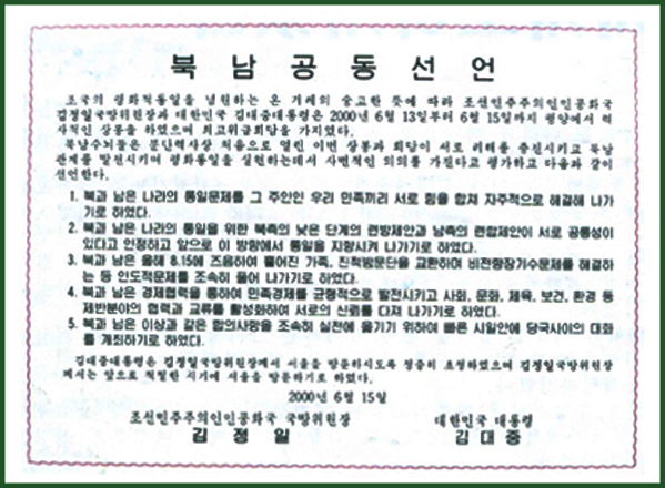 Die gemeinsame Erklärung vom 15. Juni ist ein großes Vereinigungsprogramm dazu, der Geschichte der mehr als ein halbes Jahrhundert langen Teilung Koreas ein Ende zu setzen und das 21. Jahrhundert zum Jahrhundert der Wiedervereinigung des Vaterlandes zu machen. Daher gilt sie als ein unvergängliches Banner der Bewegung für die Wiedervereinigung Koreas. Im ersten Artikel der gemeinsamen Nord-Süd-Erklärung vom 15. Juni, die aus 5 Artikeln besteht, steht: "Der Norden und der Süden haben vereinbart, die Frage der Wiedervereinigung des Landes mit vereinter Kraft der koreanischen Nation, der Herrin der Frage, selbständig zu lösen."