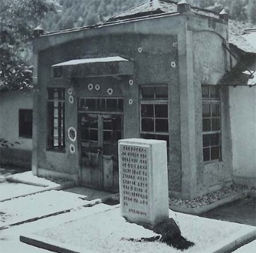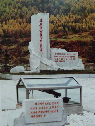 Wir besichtigten unweit von der Bronzestatue des Präsidenten die ehmalige Kommandostelle. Die Führerin sagte: "An diesem bedeutsamen Ort hatte Kim Il Sung die historische Schlacht in Pochonbo geleitet. Der Berg gegenüber uns ist Konjangdok. Abends am 4. Juni 1937, als es dunkel wurde, stieg er mit seiner Truppe von Konjangdok ab und kam hierher. An dem Ort, nur 140 m entfernt vom Schlachtfeld, wurde die Kommandostelle bestimmt. In der Weltkriegsgeschichte gab es noch kein Beispiel, dass eine Kommandostelle so nah am Schlachtfeld bestimmt wurde."