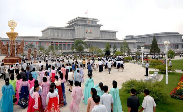 Auf dem Platz des Sonnenpalastes Kumsusan, der heiligsten Stätte des Juche, verneigten sich die Offiziere und Soldaten der KVA, Werktätigen verschiedener Kreise, Studenten und Schüler voller Ehrfrucht vor den Bildnissen von wie Sonne hell lachendem Kim Il Sung und Kim Jong Il.