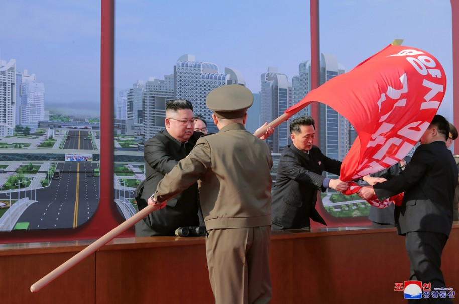 Kim Jong Un übergab persönlich den Kommandeuren die Fahne des Kommandostabes für den Bau der 50 000 Wohnungen.