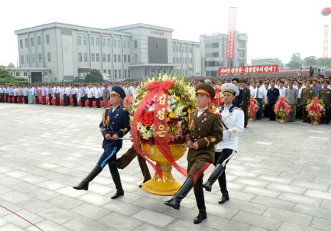 Anschließend wurden in Namen der Partei- und Staatsorgane, der Massenorganisationen, Institutionen und Betriebe aller Ebenen, GLBs und der KVA- und der KVI-Truppen und der Hochschulen im Bezirk Nord-Phyongan Blumenkörbe niedergelegt.