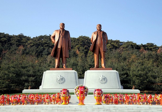 Bronzestatuen von Generalissimussen Kim Il Sung und Kim Jong Il statt, die an der Hochschule für Staatlichen Sicherheitsschutz