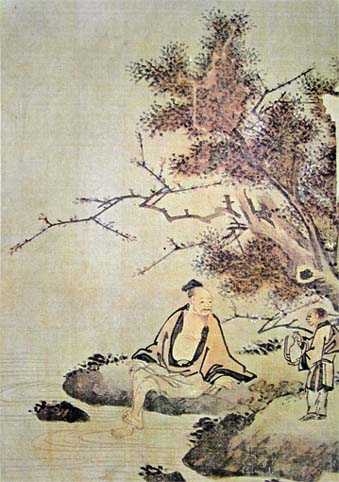 Ein Gelehrter, der seine Hose hochkrempelte und auf einem Fels sitzen bleibt, unterhält sich mit einem hinter ihm stehenden Kind, indem er seine Beine ins Wasser taucht und sich erfrischt.