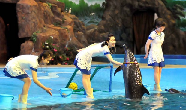 Verschiedene Tricke der Delphine, freundlich genannt Delphine von Rungna oder Delphine von Pyongyang, bereiten den Besuchern große Freude.