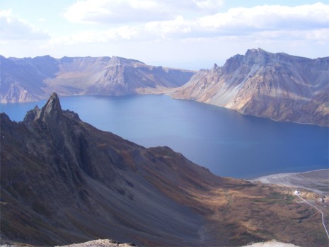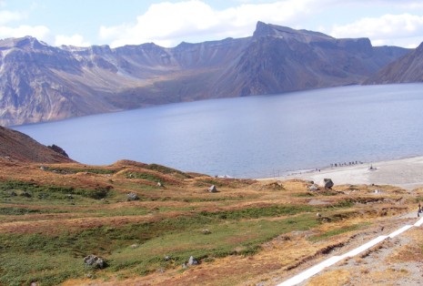 Das Gebirge Paektu befindet sich im Kreis Samjiyon, Bezirk Ryanggang im Norden der DVRK. Mit der Höhe von 2750 m über dem Meeresspiel ist es das höchste Gebirge des Landes. Ryom Chol Sun, Führerin in der Verwaltung der Revolutionären Kampfgedenkstätte Paektusan, sagt: "Das Gebirge Paektu entstand durch Vulkanausbruch vor einer Million Jahren. Im Krater, aus dem damals die Lava strömte, versammelte sich das Wasser und entstand der See Chon. Der Umfang des Sees beträgt 14,4 km, dessen Fläche 9,165 qkm, maximale Tiefe 384 m und durchschnittliche Tiefe 213,3m. Die durchschnittliche Jahrestemperatur im Gebirge misst -8,3 ℃, und die Temperatur sinkt im Winter bis -47,5 ℃. Unter vielen schönen Landschaften ist der Sonnenaufgang die beste. Unbeschreiblich sind die seltsamen Steilwände wie auch der geheimnisvolle und herrliche Sonnenaufgang, der die blaue Wasserfläche des Kratersees rot färbt."