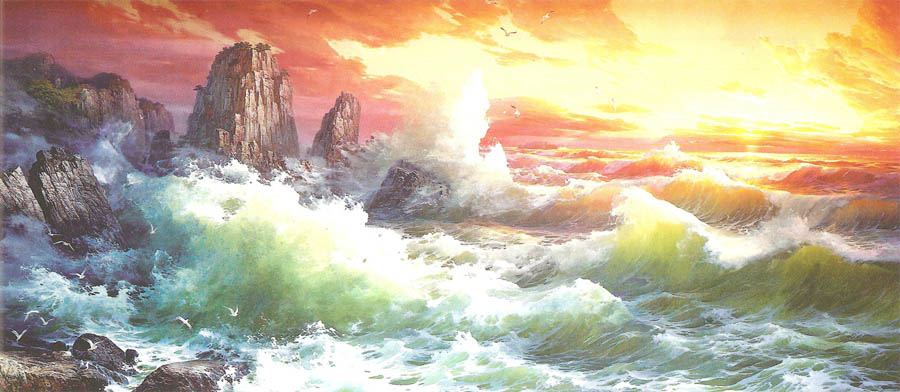 Das Koreanische Gemälde "Die Brandung von Küsten-Kumgang" zeigt die sich an die Küste brechenden gewaltigen Wellen, veranschaulicht damit die Schönheit Koreas wie auch dessen feierlichen Geist.