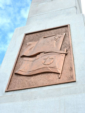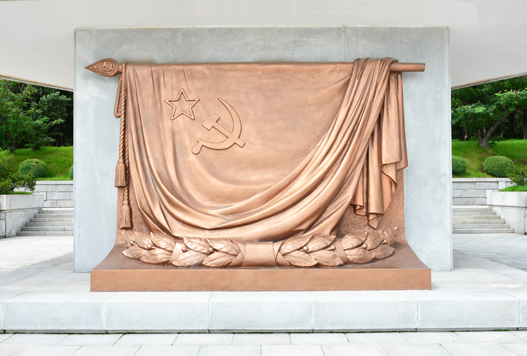An der Vorderseite des zweiten Stockes sind der Stern mit Hammer und Sichel, an der Hinterseite der fünfzackige Stern im Relief dargestellt. An den beiden Seiten sind die Staatsfahnen der DVRK und der Sowjetunion eingraviert.