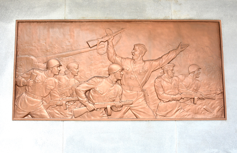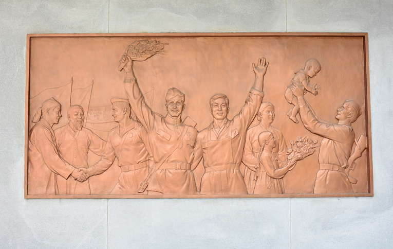 An der Vorderseite vom Erdgeschoss ist die Staatsfahne der ehemaligen Sowjetunion mit der Bronze dargestellt, und an den linken und rechten Seiten gibt es die Reliefskulpturen, die aus den Teilen von Kampf und Begegnung bestehen. An den beiden Pfeilern aus dem bearbeiteten Steinblock sind 2 Azalien, die die koreanisch-sowjetische Freundschaft symbolisieren, und der Lorbeer graviert.