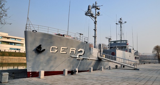 Am Fluss Pothong ist das bewaffnete US-Spionageschiff „Pueblo“ zur Schau gestellt, das Juche 57 (1968) von der Marine der KVA aufgebracht wurde.