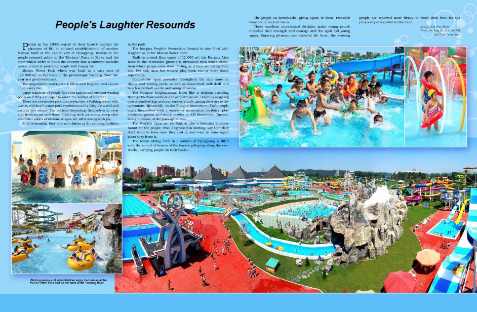 Schlängelnde verschiedenfarbige Rutschbahnen, verschiedenartige und mehrfarbige Planschbecken, Sprunganlage, künstlicher Wasserfall, Felskuppe wie seltene Felswand vom Myohyang- und Kumgang-Gebirge und Skulpturen wie lebendige Tiere…