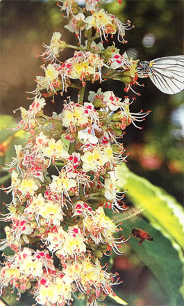 Im Mai blühen an Zweigen Blüten, und es gibt im September Früchte. An einer Blüte sind ein Pistill und 7 Staubfäden.