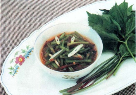 Ri Jae Son fährt fort: "An jenem Tag bereiteten die Koreaner verschiedene Spezialitäten zu, die von Frühlingsstimmung geprägt waren. Vor allem erregten Tangpyongchae und Suiumtok die größte Aufmerksamkeit. Tangpyongchae sind die klein geschnittenen Gelees aus grünen Mungobohnen, denen die mit Essig gemischte Sojasauce beigegeben wird. Es wirkt ganz frisch und einmalig.Suiumtok wird wie folgt zubereitet. Ein Teig aus Reismehl lässt man schellenförmig gären. Dann wird es mit Alkohol bespritzt und gekocht. Außerdem bereitete man verschiedene Gerichte aus Wildgemüse zu, das auf den Bergen in großen Mengen vorhanden ist. Die bedeutendsten waren Adler- und Königsfarn, Aralie, Pimpernell und Aster."