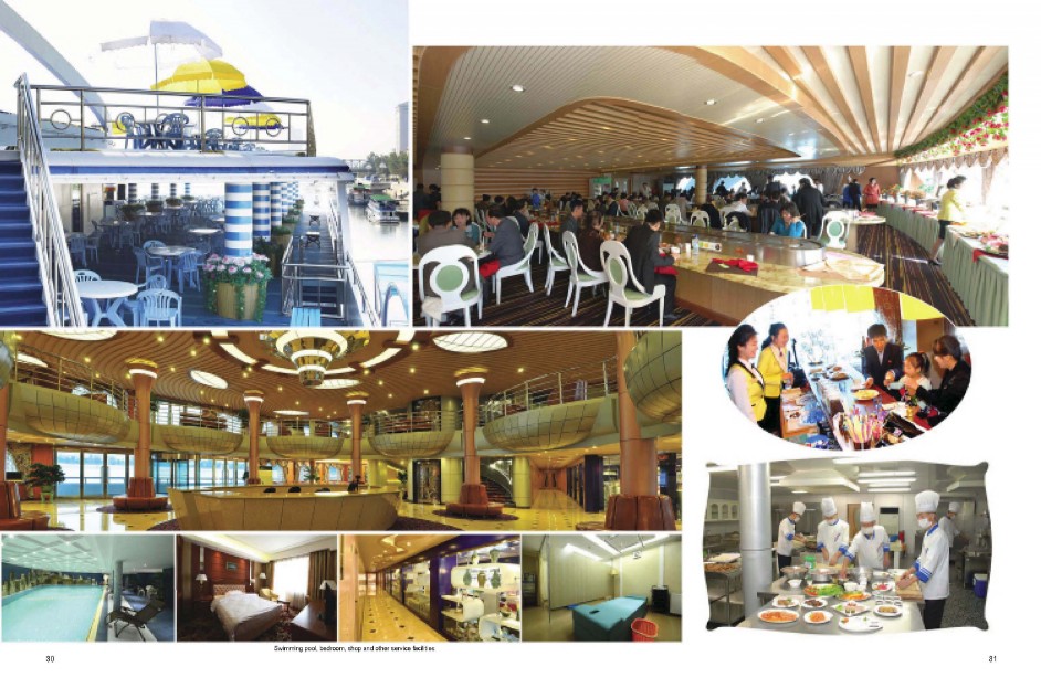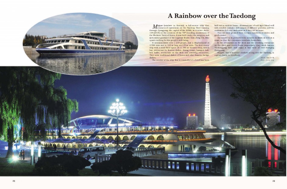 Auf dem Fluss Taedong, der durch Pyongyang, Hauptstadt der DVRK, fließt, fährt der Vergnügungsdampfer "Regenbogen" (Combined Service Ship "Mujigae"). Der Dampfer wurde am 5. Oktober des Vorjahrs in Betrieb genommen. Der Vergnügungsdampfer "Regenbogen" ist eine komplexe Dienstleistungsanstalt sowie ein originelles Mittel für ihr Kulturleben. Auf einmal können mehr als 1000 Passagiere eine Schifffahrt auf dem Fluss Taedong unternehmen, wobei ihnen die koreanischen Nationalgerichte und die weltberühmten Gerichte angeboten werden.