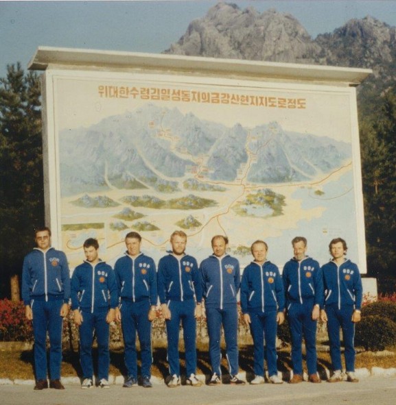 Mannschaftsfoto der DWBO-Delegation im nordkoreanischen Kumgangsan-Gebirge, Oktober 1985, v. l. n. r.: Joachim Schindler, Dirk Völkel, Georg Arnold, Bernd Zimmermann, Dietmar Heinicke, Gerd Schöne, Siegfried Anders (Delegationsleiter), Bernd Arnold