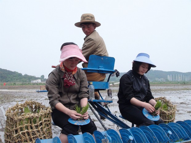 Zurzeit ist auf den breiten Feldern der Genossenschaftlichen Landwirtschafts-betriebe der DVRK die Umpflanzung von Reissetzlingen in vollem Gange. Alle Werktätigen der Landwirtschaft des ganzen Landes bemühen sich darum, die Umpflanzung von Reissetzlingen, die als ein wichtiger Prozess beim Ackerbau des Jahres gilt, rechtzeitig zu beenden. Angesichts des Umstandes, dass eine verheerende Dürre fortdauert, setzt man für die Suche nach neuen Wasserquellen große Kraft ein und führt die Umpflanzung der Reissetzlinge wie geplant durch. Der Reisanbau bei Dünnsaat mittels der Nährstoffsetzlinge, eine neue wassersparende Ackerbaumethode, die einen sicheren Ertrag in der Dürre garantiert, wird breit eingeführt und verallgemeinert. Im Einklang mit der Einführung der Nährstoffsetzlinge, die viel Mühe kostet, organisiert man mit gemeinsamer Weisheit den wissenschaftlich-technischen Forderungen entsprechend den Transport von Reissetzlingen und die Arbeit für Furchenziehung. Man beschafft sich viele Setzlingskisten, die für den Transport der Reissetzlinge nötig sind, zieht mit Maschinen die Furchen und erhöht das Tempo des Reispflanzens.