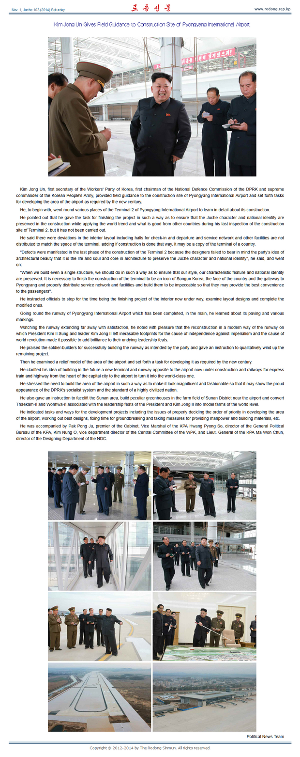 Kim Jong Un, Erster Sekretär der PdAK, Erster Vorsitzender des Verteidigungskomitees der DVRK und Oberster Befehlshaber der KVA, leitete den Bau des Pyongyanger Internationalen Flughafens vor Ort an und stellte die Aufgabe dafür, dieses Gebiet gemäß den Forderungen des neuen Jahrhunderts zu entwickeln.