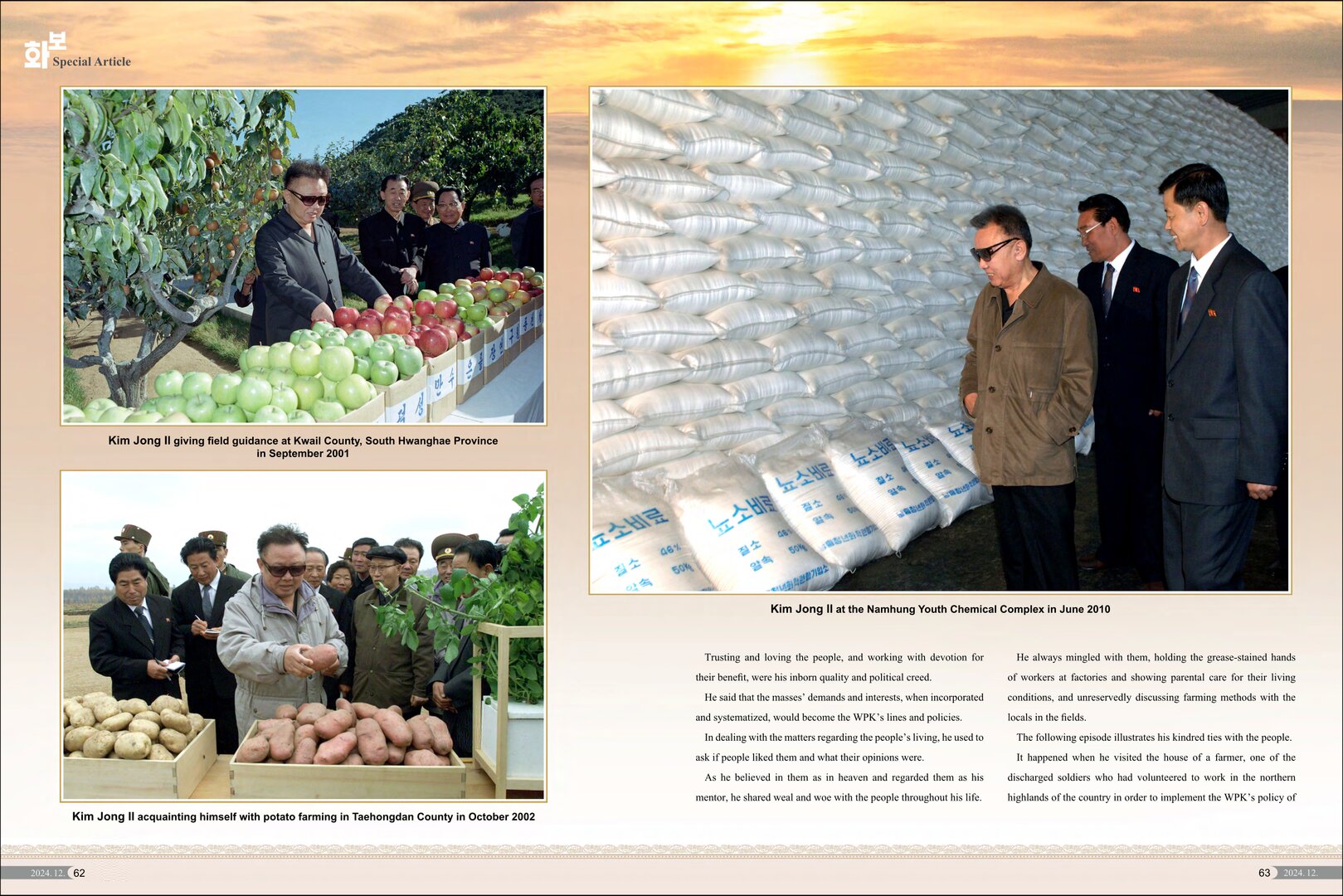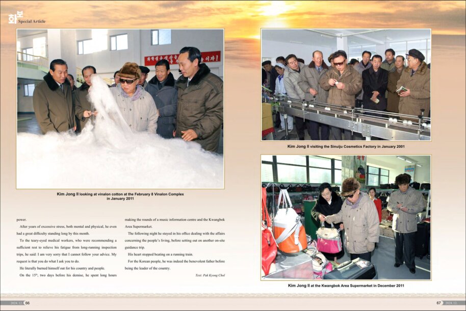 Er setzte sich zeitlebens mit aller Mühe und Seele für Aufblühen und Gedeihen des Vaterlandes ein, und seine Spuren sind in den Betrieben und Dörfern deutlich eingeprägt. Heute vollziehen sich in allen Bereichen des sozialistischen Aufbaus wirkliche Veränderungen und Entwicklungen. Diese bewundernswerte Wirklichkeit ist undenkbar, losgelöst von der von Kim Jong Il unter großem Aufwand gefestigten Grundlage der selbstständigen Wirtschaft.
