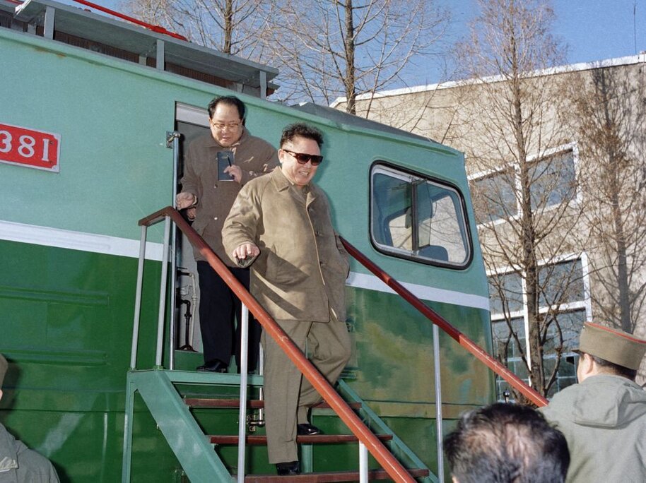 Kim Jong Il bei der Vor-Ort-Anleitung des Vereinigten Elektrolokomotivenwerkes „Kim Jong Thae“, Januar 2002