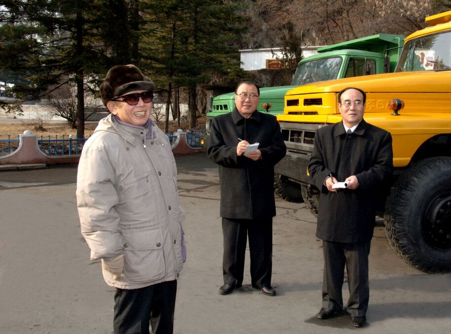 Kim Jong Il bei der Vor-Ort-Anleitung des Vereinigten Kohlenabbaumaschinenwerkes Ranam, August 2001