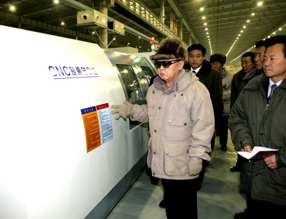 Kim Jong Il bei der Begutachtung von CNC-Werkzeugmaschinen neuen Typs, Dezember 2010