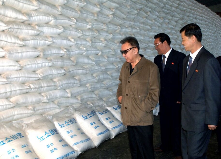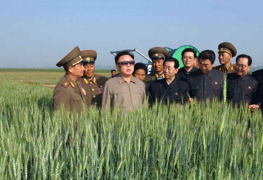 Kim Jong Il bei der Vor-Ort-Anleitung eines Landwirtschaftsbetriebes, Juni 2003