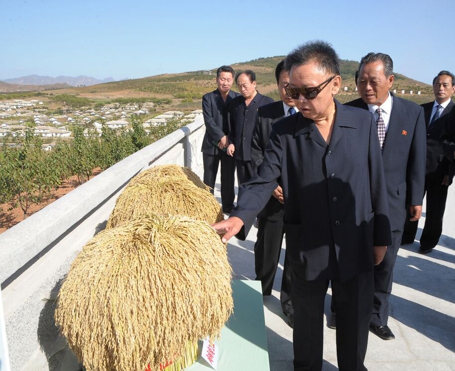 Kim Jong Il bei der Vor-Ort-Anleitung des Genossenschaftlichen Landwirtschaftsbetriebes Migok in der Stadt Sariwon, Oktober 2009