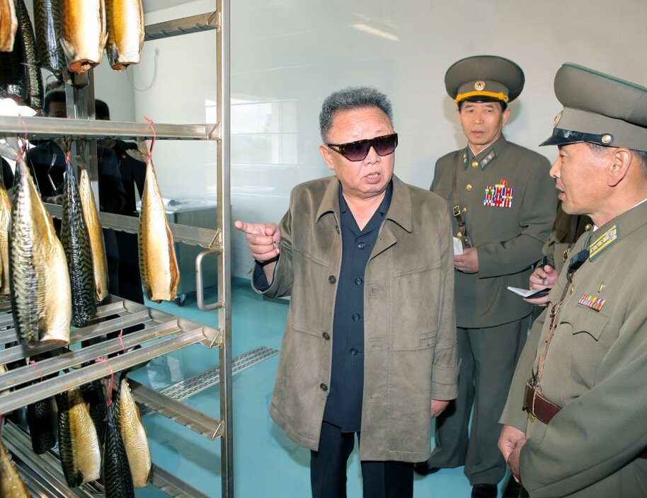 Kim Jong Il bei der Vor-Ort-Anleitung des Forschungsinstitutes für Fischzucht, Juni 2011