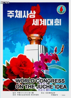 “The World Congress of the Juche Idea 2012″ - Posters on the World Congress on the Juche Idea were produced in the DPRK. The Congress is to be held with splendor in Pyongyang on the occasion of the birth anniversary of President Kim Il Sung. The posters reflect the unanimous aspiration and desire of the followers of the Juche idea and progressive humankind to victoriously push forward the socialist movement and global independence, guided by the Juche idea. A poster depicts the Tower of the Juche Idea and Kimilsungia and Kimjongilia in full bloom against the background of the globe. It deals with the fact that thanks to the Juche idea, the original revolutionary philosophy, there came a new era in the development of human history, the era of Juche in which the popular masses carve out their destiny independently and creatively. There is also a poster depicting people holding “Kim Il Sung’s Selected Works” and leader Kim Jong Il’s works “On the Juche Idea” and “On Some Problems of Education in the Juche Idea” in their hands and the Chollima Statue.It reflects the firm will of the Korean people and progressive mankind to actively study and disseminate the Juche idea which is evoking strong support and response among the world people for its truth and tremendous vitality and invariably advance along the road of Juche. The words “World Congress on the Juche Idea” and the logo of the Congress are seen on the posters. (4/2012)