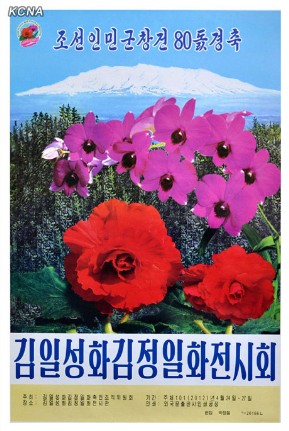 “14th Kimilsungia Festival” -Posters on the 14th Kimilsungia Festival and the Kimilsungia-Kimjongilia Exhibition have been produced. They will be held with splendor to mark the centenary of the birth of President Kim Il Sung (the Day of the Sun) and the 80th birthday of the Korean People’s Army.The poster on the festival depicts the old home of the President in Mangyongdae and the immortal flowers against the background of the blue sky over the country.Seen in its upper part are the letters “The great leader Comrade Kim Il Sung will always be with us” and in its lower part letters “The 14th Kimilsungia Festival.”The poster on the exhibition depicts the flowers of the sun against the background of Mt. Paektu and deep forest.Seen on the poster are words “Celebration of the 80th birthday of the Korean People’s Army” and “The Kimilsungia-Kimjongilia Exhibition.”Logos of the festival and exhibition, places and periods are given on them. (4/2012)