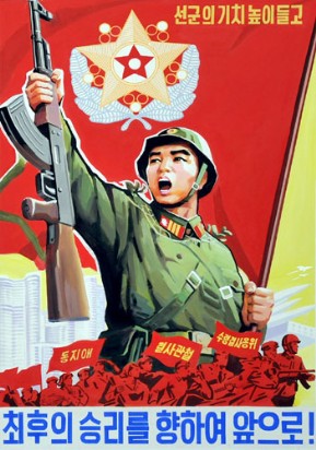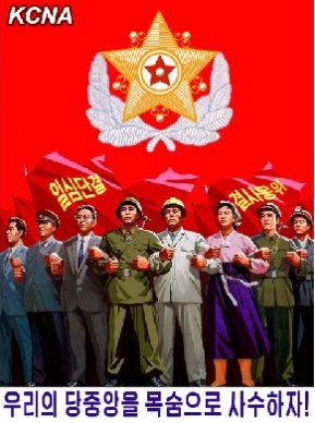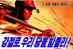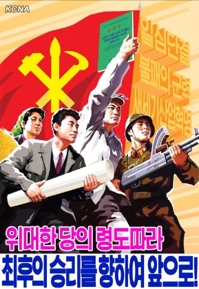“Forward to final victory under the leadership of the great party!” -It vividly represents a serviceman, a worker, a farmer and an intellectual out in the drive to realize the noble intention of the dear respected Kim Jong Un, flying the flag of the Workers’ Party of Korea.Seen on the poster are words “Single-minded unity,” “Invincible military capability” and “Industrial revolution in the new century” which reflect a strategic line for building a thriving socialist nation.It calls upon all the service personnel and people to advance full of confidence towards the final victory in the cause of building a thriving nation, united close behind the great party. (7/2012)