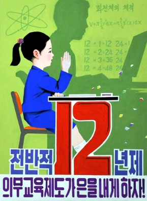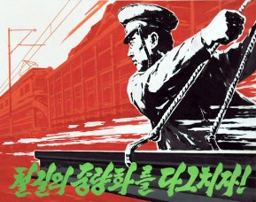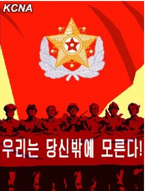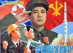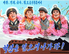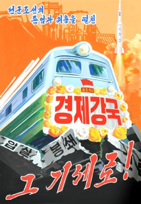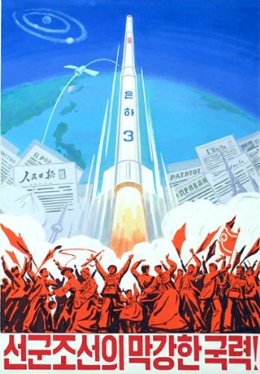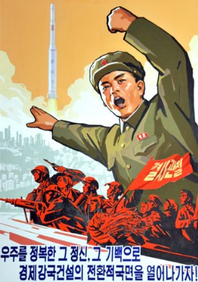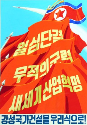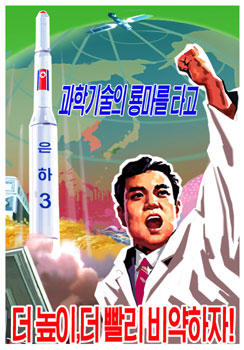 Poster “Let us leap higher and faster riding a fleet steed of science and technology!” portrays satellite Kwangmyongsong 3-2 flying in space fully demonstrating the space science and technology of Juche Korea and its overall national power, and a scientist calling for pushing back the frontiers of latest science and technology.It calls for making great innovation and surge in all fields of building a thriving nation with the same spirit with which scientists and technicians who manufactured and launched the Juche-based working satellite and fully displayed the dignity and might of Songun Korea. (1/2013)