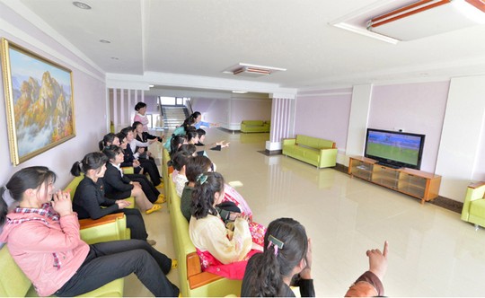 Im Gelände des Arbeiterheims gibt es einen gemütlichen Park und einen Volleyballplatz, wo man sich von der Arbeit ausreichend erholen kann. Es ist wirklich in aller Hinsicht ein wunderbares Arbeiterheim. Weberinnen Kang Jin Hyang und Paek Hyang Ok sagen: "Dieses entzückende und prächtige Haus ist unser Arbeiterheim. Wenn wir von der Arbeit kommen, warten weiches Bett, leckeres Essen und alle Dienstleistungseinrichtungen wie Bibliothek, Damensalon und Ambulanz auf uns. Dank der Fürsorge des Staates leben wir ohne Sorge."