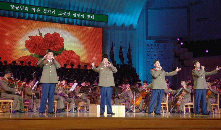 Die lauten und kräftigen Gesänge vom Verdienten Staatlichen Chorensemble, die die Herzen der ganzen Armee und der gesamten Bevölkerung fesselten, gaben den Koreanern mehr Kraft als Hunderttausende Tonnen Getreide. Sie sangen die Lieder des Kredos wie "Wir vergessen nicht", "Der Weg zum Sieg" und "Lebt heute für das Morgen!" und erhoben sich gewaltig. Mit eigener Kraft modernisierten sie die Arbeitsplätze und gestalteten die Straßen und Dörfer völlig um. Dank der Gesänge wurden auch die Wundertaten bei Erreichung des Weltniveaus vollbracht.