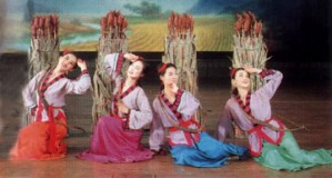 Scene 4 shows through the optimistic dance movement the sincerity and patriotism of women in the Walled City of Pyongyang through the diligent working life of girls practising an archery while reaping a harvest in their native land where grains ripen.