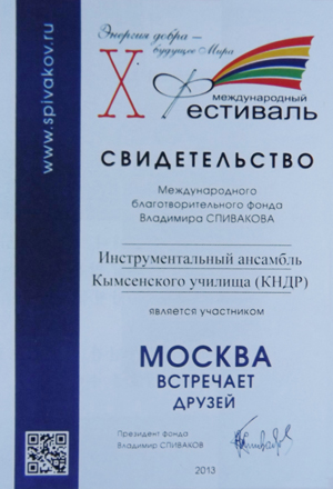 Die Schüler der Kumsong-Schule zeigten beim 10. Internationalen Festival "Moskau empfängt die Freunde" ausgezeichnete künstlerische Talente und hohes Darstellungsniveau. Diesen Kindern, die verschiedene Musikinstrumente abwechselnd spielten und dadurch die Darbietung eigenartig gestalteten, zollten die begeisterten Zuschauer starken Beifall.
