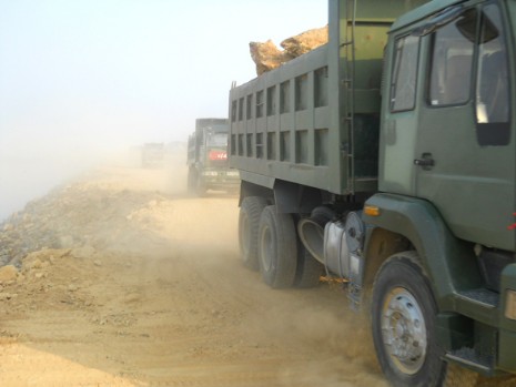 Beim Marschlandbau um die Insel Honggon werden durch die Verbindung von mehreren Inseln auf dem Meer vor Sonchon Tausende Hektar große neue Böden gewonnen. Die Arbeiter des Vereinigten Marschlandbaubetriebes des Bezirks Nord-Phyongan sind für diese enorme Bauarbeit zuständig. Die Bauarbeit hat vor nur 2 Jahre begonnen. Doch die Arbeit für die Aufschichtung von Erde und Steinen an den Dämmen Nr. 1, 2 und 4 ist bereits im wesentlichen zu Ende gegangen, und nun ist der Bau des Damms Nr. 3 in vollem Gange. In mehreren Steinbrüchen sind die Vortriebsarbeiter zu sehen, die die Bohrmaschinen fest in ihren Händen halten und für die Sprengungen von 100 000 Kubikmeter und 300 000 Kubikmeter großen Berge Bohrungen in die Felsen vortreiben.